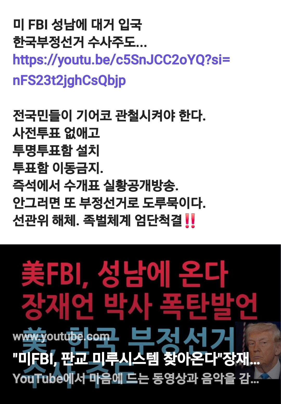 | 사전투표 없애고, 투명투표함 설치 투표함 이동금지. 즉석에서 수개표 실황 공개방송. 안그러면 도루묵이다. 선관위 해체. 족벌체계 엄단척결‼️ (3) | 2026.01.11 |